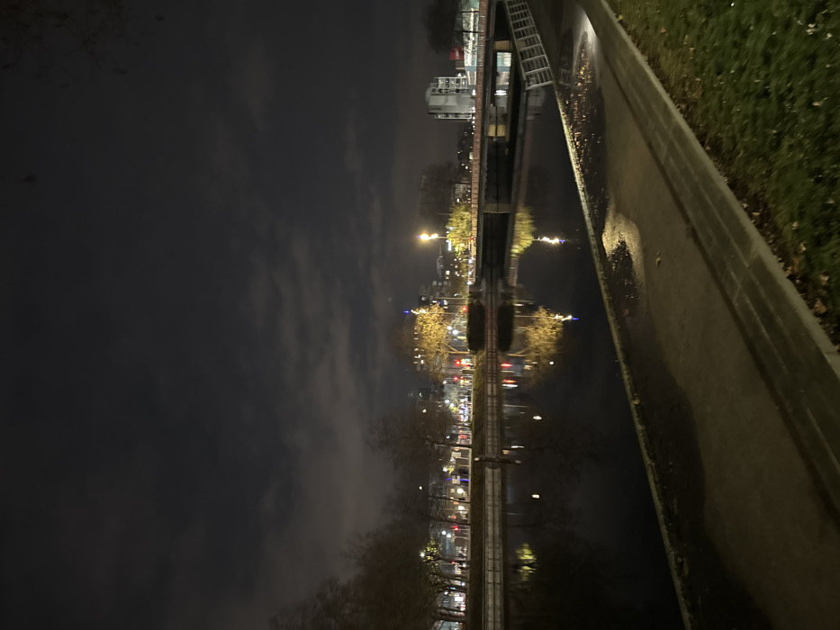 A night scene reflecting in a canal. Buildings and streetlights illuminate the water's surface, creating a distorted reflection. Trees line the bank with a few lights visible in their branches. A wet pavement borders the canal with a grassy verge to the right. The sky is a dark expanse with patchy clouds, barely visible. The image is rotated to the left.