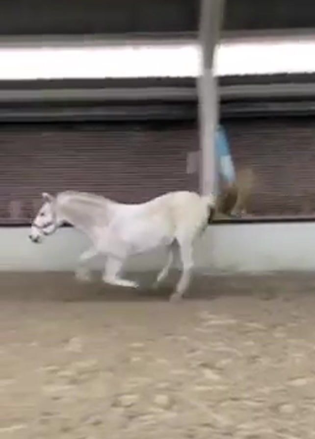 - "A white horse with brown and black markings is seen jumping over a low wooden jump in an indoor riding arena" by FM-xTDQG2, licensed under CC BY 4.0