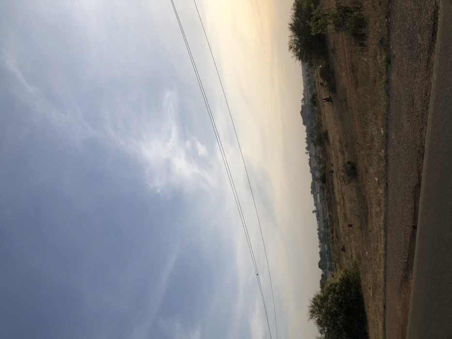 A landscape picture shows a cloudy sky occupying the left half, with power lines stretching across. The right half features a dry, grassy field with scattered trees and vegetation. A road edge runs along the right margin. The horizon is hazy and indistinct, suggesting a dusty atmosphere. The scene evokes a sense of rural expanse under a muted, somewhat overcast sky.