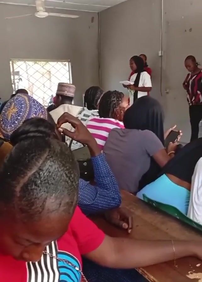 classroom scene with rows of desks occupied by various people. In the foreground, a person in a red shirt with a black and white pattern is seated, and only the back of their head is visible. Other individuals can be seen sitting at the desks, some of them looking at their phones or resting their heads in their hands. At the front of the room, a woman wearing a white top and a black hijab is holding a document and appears to be addressing the room. Another woman in a red shirt is standing nearby, seemingly assisting or co-presenting. There is a ceiling fan visible above, and a window with a barred view to the outside. The room's walls are a muted gray, and the overall atmosphere seems to be of a casual, perhaps educational, setting.