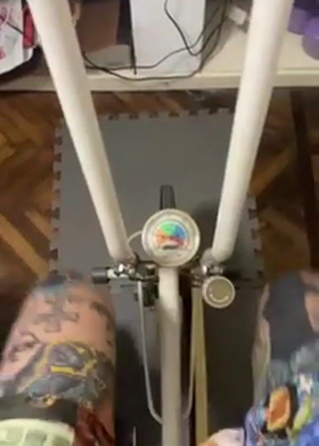 A first-person perspective video shows an individual riding a stationary exercise bike