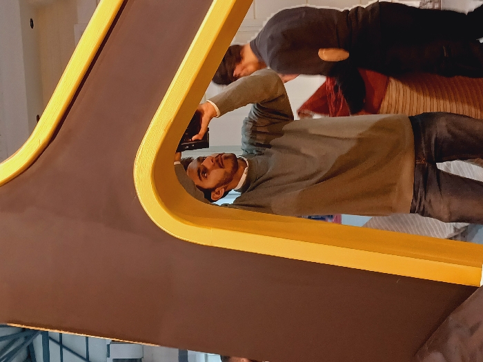 The scene is located indoors in Shab'a, Syria. A young adult male is positioned centrally, partially framed by a large, two-toned architectural element. He has a light skin tone, dark hair, and a neatly trimmed beard and mustache. He wears a grey long-sleeved sweater over a white collar and dark blue jeans. Both hands are raised, holding a black rectangular electronic device, likely a smartphone or camera, upwards and slightly to his right, suggesting he is capturing an image or video above the visible frame or around the structure. The dominant foreground object is a substantial, curving structure with broad, flat surfaces in a solid brown color, outlined by thick, rounded borders in a bright yellow or gold hue. This structure forms a partial arch or frame, partially obscuring the top and sides of the image. To the right and slightly behind the primary subject, a second individual is partially visible from the back, wearing a dark long-sleeved shirt with a light brown oval patch on the right elbow. Their head and lower body are out of frame or obscured. The background reveals an indoor environment with a light-colored wall or partition behind the second individual. Above, portions of a light-toned ceiling with visible structural beams or supports are discernible, indicating a large indoor space. The lighting is consistent with artificial illumination.