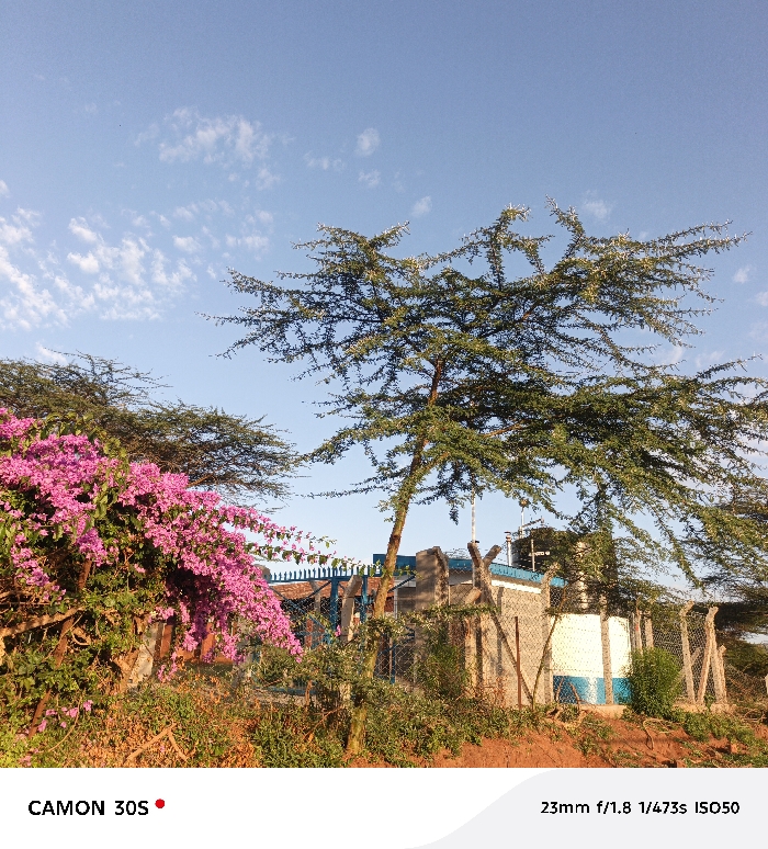 The landscape features a clear blue sky with scattered clouds, above a vibrant scene of nature and infrastructure. A large, spreading tree dominates the right side, while a burst of pink flowers adorns the left. Behind the flora and fauna, a fenced-in structure with blue accents stands, suggesting a utility or service building. The foreground is filled with dry grass and earth, adding a rustic texture to the composition. The image is captured with a CAMON 30S camera at 23mm, f/1.8, 1/473s, and ISO 50.