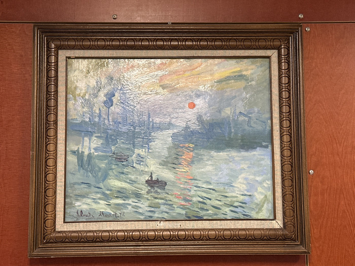 - "A rectangular, framed painting, likely a reproduction of Claude Monet's *Impression, Sunrise*, is affixed to a reddish-brown wooden paneled wall in an unspecified indoor location in Aubervilliers, France" by FM-lS6eB2, licensed under CC BY 4.0