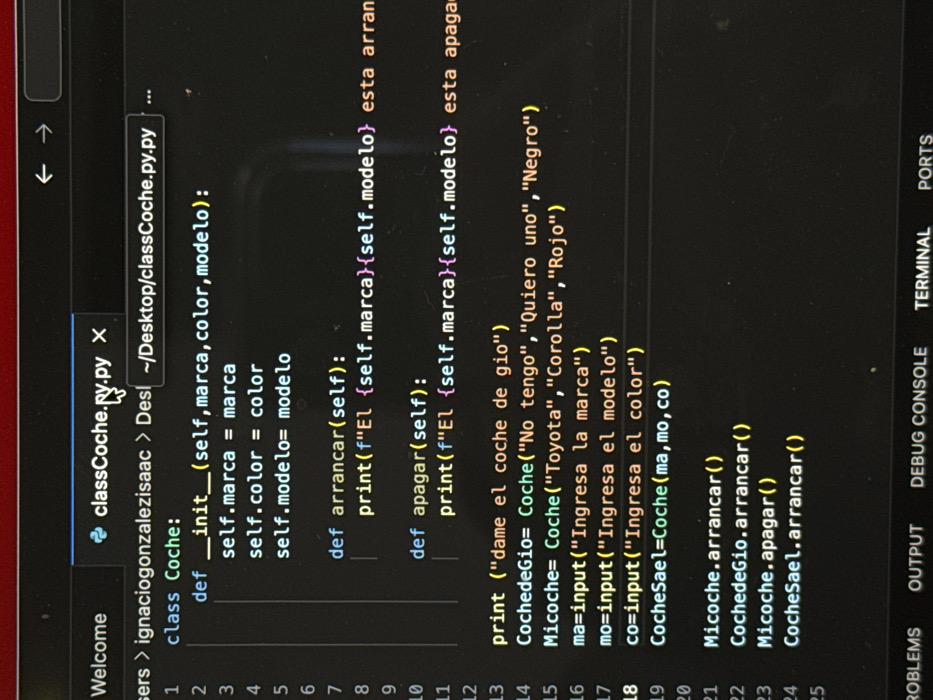 The image displays a computer monitor screen, operating within San Bernardino Tlaxcalancingo, Mexico, showing a dark-themed integrated development environment, likely Visual Studio Code. The screen exhibits Python code from a file named `classCoche.py`, located on the desktop path `users > ignaciogonzalezisaac > Desl ~/Desktop/classCoche.py`. The code defines a `Coche` (car) class with an `__init__` constructor and methods `arrancar` (start) and `apagar` (turn off). Below the class definition, there are lines of code instantiating `Coche` objects, prompting for user input for car attributes (marca, modelo, color), and calling the `arrancar` and `apagar` methods on these instances. The screen's surface shows minor reflections, and the surrounding environment is dark, suggesting low ambient light. No individuals or external objects are discernible beyond the monitor display.