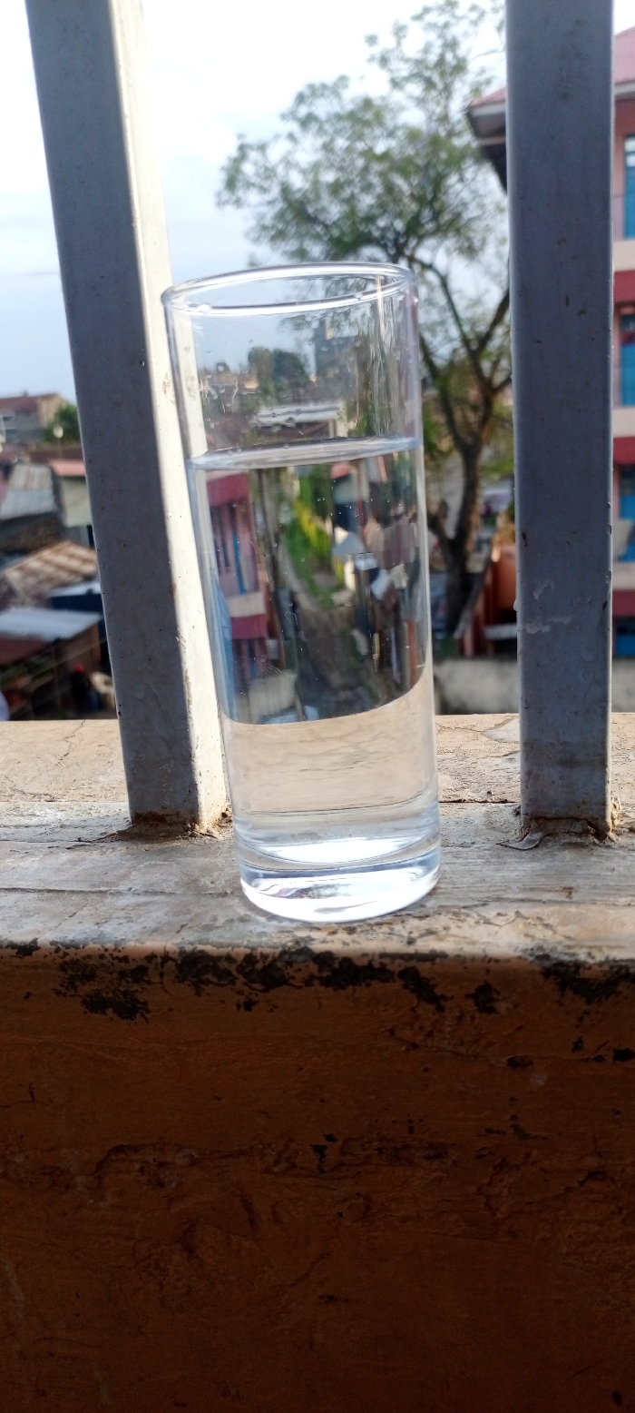 - "A clear, cylindrical glass, filled approximately two-thirds with clear liquid, rests on a weathered, light grey concrete ledge" by FM-9Bkv62, licensed under CC BY 4.0