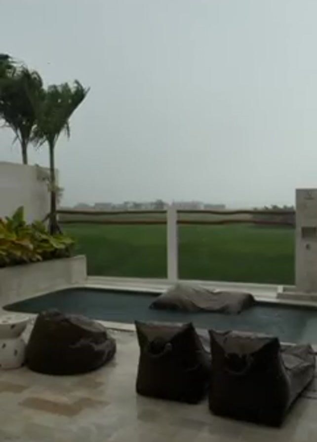 patio scene during heavy rain. On the tiled patio floor, there are three beanbag chairs. A small, dark swimming pool sits beyond the patio, with a covered, floating lounge in the middle. Beyond the pool is a vibrant green lawn or field, ending at a distant, hazy skyline of buildings. Palm trees sway in the wind on the left side of the frame. The sky is overcast and rain is visibly falling across the scene.