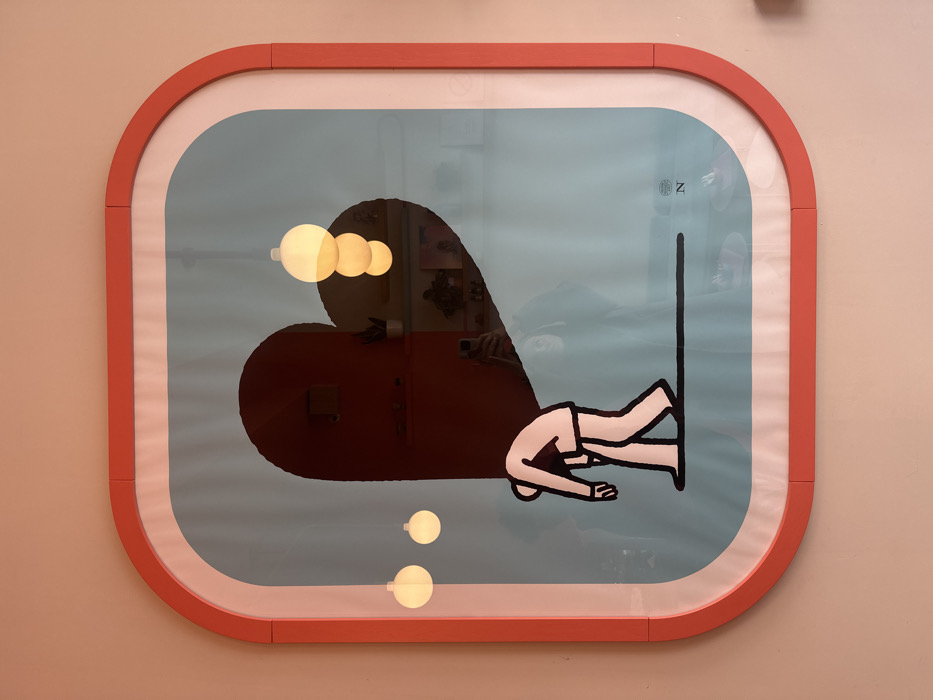 A large, rounded rectangular framed artwork hangs centrally on a light peach-colored wall. The frame features a coral-red outer border and a thinner white inner border. The artwork itself depicts a stylized illustration on a light blue background. In the upper right quadrant, a large, dark red heart shape is visible. Below it, a two-dimensional, white figure with black outlines, appearing male and dressed in a suit, walks from left to right with a slumped posture, head down, and arms hanging. A long, dark shadow extends from the figure to the right. A faint "N" logo or signature is present in the bottom right corner of the print. The glass covering the artwork reflects the interior environment. Prominently reflected are spherical pendant light fixtures: two individual lights appear in the upper left, and a stack of three lights is reflected in the upper right. Faint reflections of a room's interior, including shelves with objects, are visible, particularly through the red heart shape. A partial reflection of a person holding a smartphone is discernible in the lower right section of the heart, consistent with the photographer's position. The scene is located within The Social by KafeKultura, Belgrade, Serbia.