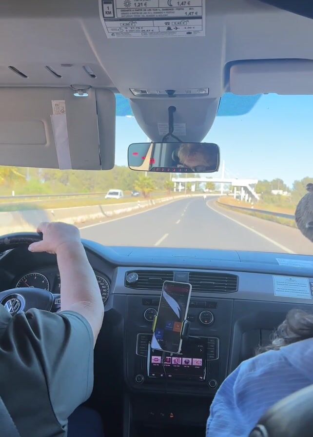 From inside a taxi, a passenger films the view through the front windshield while driving on a highway. The driver is seen in the left side of the frame, wearing a green shirt and has hands on the steering wheel of a Volkswagen. The passenger in the front seat to the right of the driver is wearing a blue shirt and a hat. A cell phone in a holder is attached to the dashboard playing music. In the center of the frame, one can see the open highway, a bridge ahead, and green vegetation on either side of the road. A sign with taxi fares is visible above the rearview mirror. The sky is clear and blue.