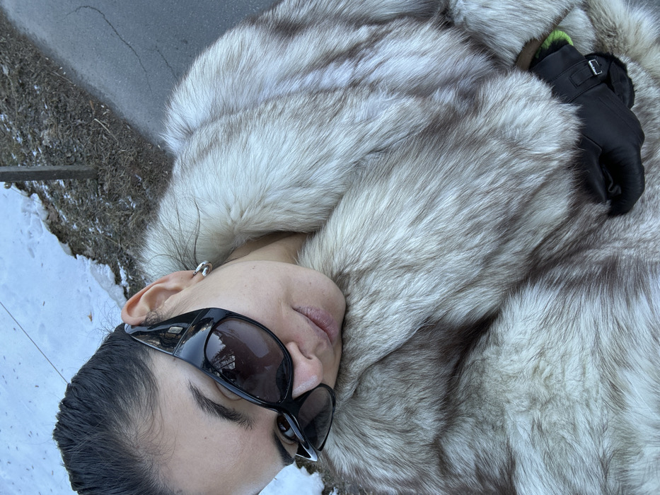 The image displays a partial view of a female subject outdoors in Saanen, Switzerland. The subject's head, with dark hair pulled back, is tilted and rests on a voluminous, multi-toned fur coat primarily composed of light grey and brown fibers. She wears large, dark-tinted wraparound sunglasses that obscure her eyes, and a single silver hoop earring is visible on her right earlobe. Her lips exhibit a subtle upward curve. A black winter glove with a visible lime green interior cuff is present on the subject's left hand, partially concealed by the fur coat in the lower right quadrant of the image. The outdoor environment in the background features patches of snow on brown earth, a dark asphalt path, and a vertical dark-colored pole. Reflections in the sunglasses show indications of trees and sky.