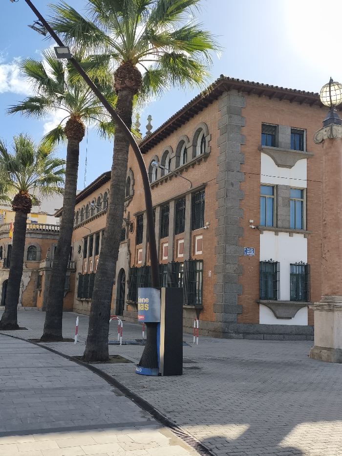 The image displays an urban scene featuring a multi-story building constructed of red brick with grey stone accents, situated on a paved street or square in an unknown city. The building, visible on the right, features a terracotta-tiled roof with an overhang and decorative elements, including a series of arched windows on the upper floor. Lower windows are equipped with dark shutters or grilles. The corner of the building on the right exhibits a distinct architectural section with white and grey stone elements and blue-tinted windows. A street sign reading "C. de C. del Arzobispo" is affixed to this corner. Another older building with a tiled roof is partially visible further to the left. In the foreground, the ground is paved with light-colored blocks, traversed by a dark linear drainage grate. Several tall palm trees with textured trunks and green fronds line the paved area, partially obscuring the buildings. A modern, dark-colored, curved streetlamp with an LED fixture is prominent in the mid-ground, positioned between palm trees. A black and blue kiosk or information panel, displaying the partially visible text "tiene nas," stands centrally in the mid-ground. Red and white striped U-shaped bollards are visible near the bases of the palm trees and the kiosk. On the far right, a stone pillar supports an ornate globe-style streetlamp. The scene is illuminated by bright natural sunlight, casting defined shadows on the paved surface. The sky is clear blue with scattered white clouds. No individuals or vehicles are present within the frame.