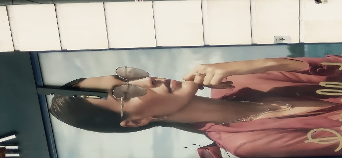 An outdoor advertising poster on a building facade in Lens, France, depicts a female model in profile, facing right. The model has dark hair pulled back and wears large, light-lensed sunglasses with decorative frames, small earrings, and multiple delicate silver-toned necklaces over a pink, sheer, open-collared shirt. Her right hand is positioned under her chin, displaying a thin ring on her ring finger. The poster's background is blurred, showing light blue and white tones. Partially visible gold script, beginning with "D," is present at the bottom left. Above the poster, a dark fascia with fragmented white lettering is discernible. To the right of the poster, a section of a building wall clad in light-colored, rectangular panels or tiles is visible, along with a small dark rectangular fixture. A black vertical support bracket extends from the top of the poster towards the building's fascia.