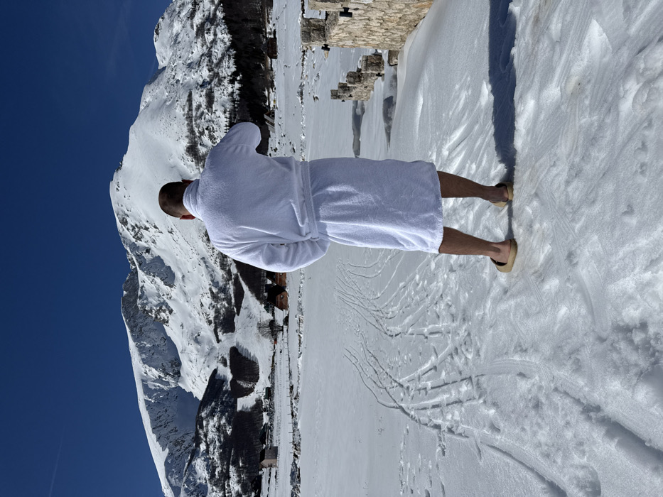 A male individual is depicted from behind, standing outdoors in a snow-covered landscape identified as Motički gaj, Montenegro. The subject wears a white terrycloth bathrobe, cinched at the waist, and tan slip-on sandals, exposing bare lower legs. His right arm is bent at the elbow, with the hand raised towards his head or upper shoulder area. He stands on a layer of packed snow, which displays numerous ski or snowboard tracks and footprints to his left. To his immediate right, a low, light-colored stone wall with integrated light fixtures is partially visible. In the midground, a vast, flat expanse of snow stretches towards the distant mountains, dotted with several small, dark-roofed wooden cabins and a faint fence line. The background is dominated by a large, rugged, snow-covered mountain range, exhibiting exposed rock faces and a visible ski slope on one flank. The sky above is clear and deep blue. The scene is brightly illuminated by direct sunlight, casting distinct shadows.