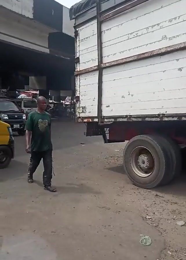 man walking in a busy outdoor area, possibly in a city. He is wearing a green t-shirt and grey pants. He walks past a large truck with a white cargo container. Behind him, there's a yellow van and a black van in the street. A bridge is overhead, painted with black and white stripes. Other people and vehicles can be seen in the background. The traffic light is green. The ground appears dusty and uneven.