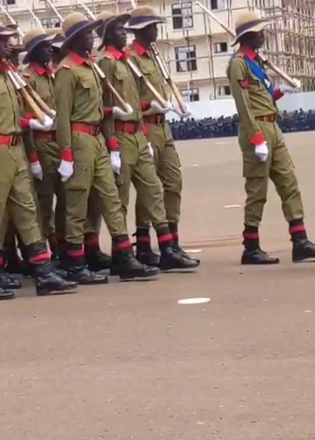 A low-angle video shows a long line of young men, seemingly soldiers, marching on what appears to be a parade ground or large, paved area. The men are arranged in a line, and a few others are out front. All are wearing identical uniforms, consisting of khaki-colored pants and long-sleeved shirts with red belts, and straw hats. They are all wearing white gloves and black boots. Each man holds a rifle. In the background are other people and a building under construction. The weather appears overcast, and the lighting is somewhat flat.