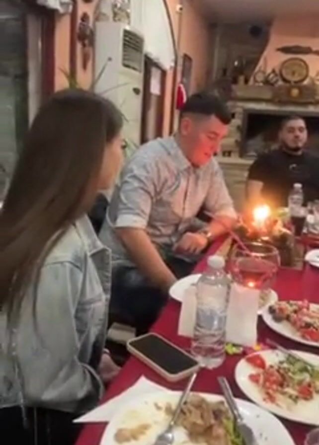 Several people are seated around a long, rectangular table set for a meal in what appears to be a restaurant. The table is covered with a red tablecloth and is cluttered with plates of food, water bottles, glasses, and bottles of alcohol. The room has a fireplace in the background and a general warm, rustic aesthetic. The scene starts with a man in a patterned shirt blowing out the candles on a small cake. Immediately following, a sound effect resembling an explosion is heard. People around the table react with surprise or amusement, clapping their hands. A woman in a beige top claps and gestures with open arms. The scene captures a moment of celebration or surprise during a meal.