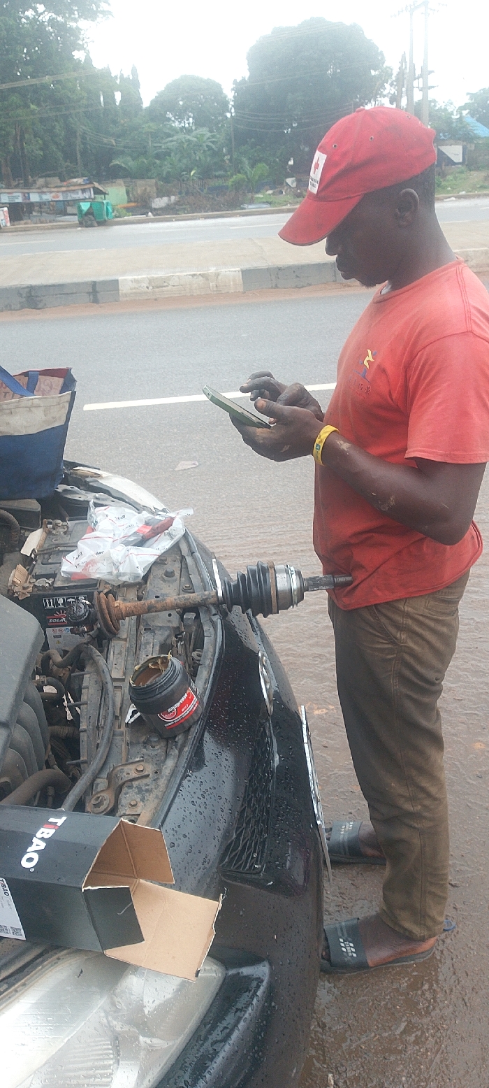 An outdoor scene in Dam Camp, Nigeria, depicts a dark-skinned male performing roadside vehicle repair under an overcast sky