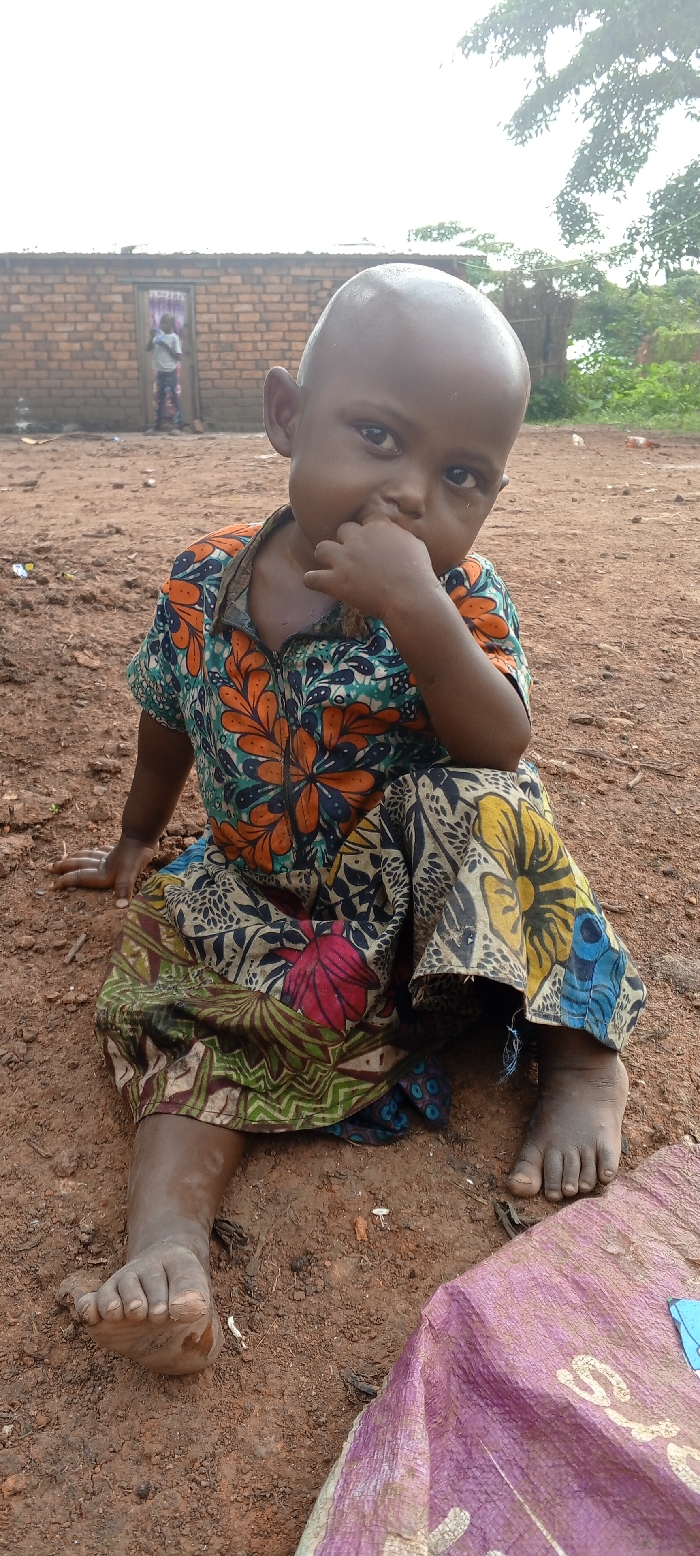 The image captures an outdoor scene in Kakungu, Democratic Republic of the Congo. A young child with dark skin and a shaved head is seated on reddish-brown earth in the foreground. The child wears a short-sleeved garment with a vibrant pattern of orange, blue, green, yellow, and red floral and geometric motifs. The child's right hand is raised, with fingers touching the mouth, and both bare feet are visible, coated with dirt. The child looks directly forward. In the background, a building constructed of exposed reddish-brown bricks features a doorway draped with a patterned fabric. A second child, wearing a light-colored top and patterned lower garment, is partially visible standing within this doorway. Sparse vegetation and trees with green foliage are present in the far background, beneath an overcast sky. A crumpled purple woven sack lies partially visible in the bottom right corner of the frame.