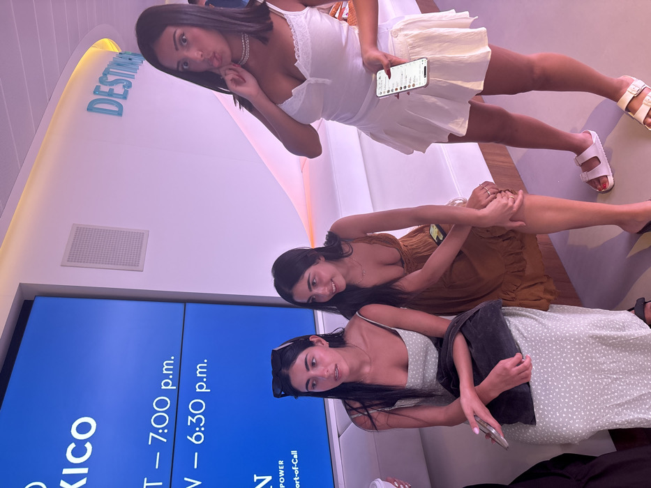 Three young adult females are depicted in an indoor waiting area, likely a port lounge or ferry terminal, in San Miguel de Cozumel, Mexico