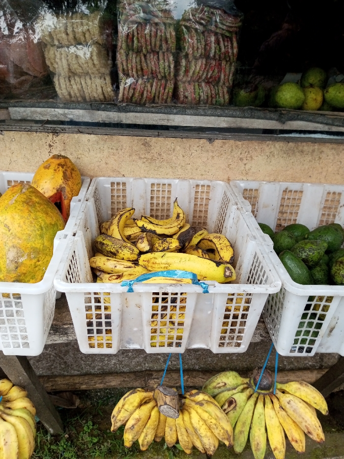 This image provides a forensic view of a market stall, consistent with street vendor operations in Pacet, Indonesia. The scene is dominated by a display of fruits and packaged snacks arranged on multiple levels. At the upper level, behind a transparent barrier, two types of packaged snacks are visible. To the left, several clear plastic bags contain stacks of light brown, crispy-looking items. To the right, similar clear plastic bags contain stacks of round, thin snacks exhibiting red and green coloration. Further right, a collection of green, spherical fruits, consistent with guavas, are visible in a darker recess. The mid-level features three white, rectangular plastic crates with perforated sides. The leftmost crate contains two large, yellow-orange papayas, one of which has a prominent dark blemish. The central crate is filled with numerous ripe bananas, characterized by yellow skin with significant brown and black spotting. A blue plastic strip or ribbon is tied around a portion of the bananas in this crate. The rightmost crate holds a quantity of green, avocado-like fruits. Below the crates, two separate bunches of ripe, yellow bananas, also exhibiting brown spotting, are suspended by blue cords. Each bunch is weighted by a small piece of wood attached to the cord. The ground beneath the display consists of sparse green vegetation, and wooden structural elements are visible. No individuals are present in the image.