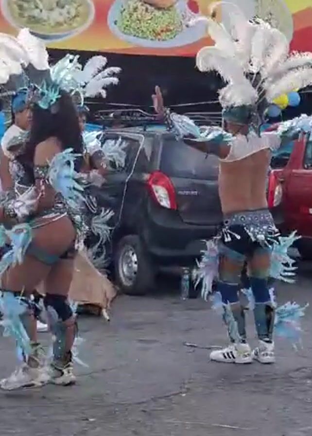 four people dancing in a parking lot. The dancers are wearing elaborate costumes with feathers and sequins. Two of the dancers are male and two are female. They are all shirtless. Behind the dancers are several cars, and a banner with images of food. A woman wearing a hat and floral top walks in front of the camera, obscuring the dancers.