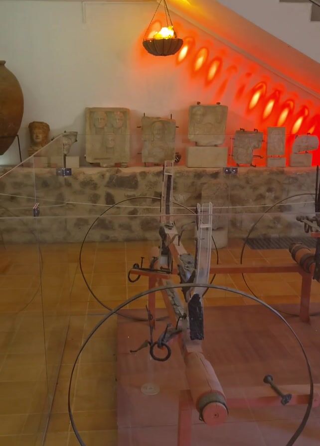 interior of a museum. There are various ancient artifacts on display, including carved stone reliefs, pottery, and what appears to be a reconstruction of an ancient device with large wheels, all behind glass barriers. The room has a tile floor, white walls, and a stone base running along the walls. Overhead, a hanging light fixture emits a warm glow, and there are other lighting elements that cast red-orange patterns on the wall. There are also various signs posted on the wall.