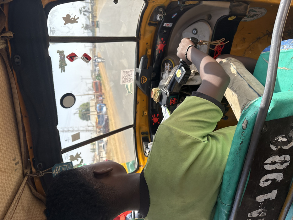 - "A rear-view perspective from inside a yellow three-wheeled motorized vehicle depicts a young person positioned at the driver's controls on a clear, sunny day in Unguwar Saya, Nigeria" by FM-XuP8y2, licensed under CC BY 4.0