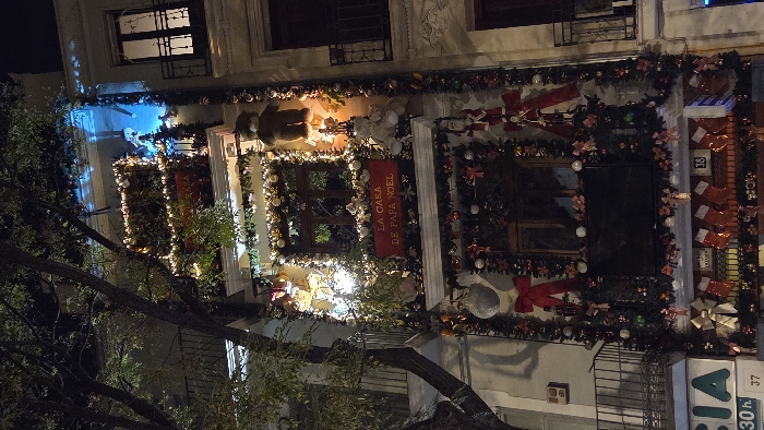 The image displays a multi-story building facade at night, extensively decorated for Christmas