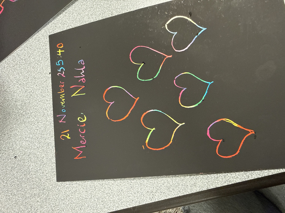 A black scratch art paper shows rainbow-colored hearts. There are six hearts scattered in a cluster towards the right side of the paper. On the left edge, the names "Mercie, Nahla" are written vertically in rainbow colors, along with "21 November 255:40". The paper rests on a light gray surface, likely a table.