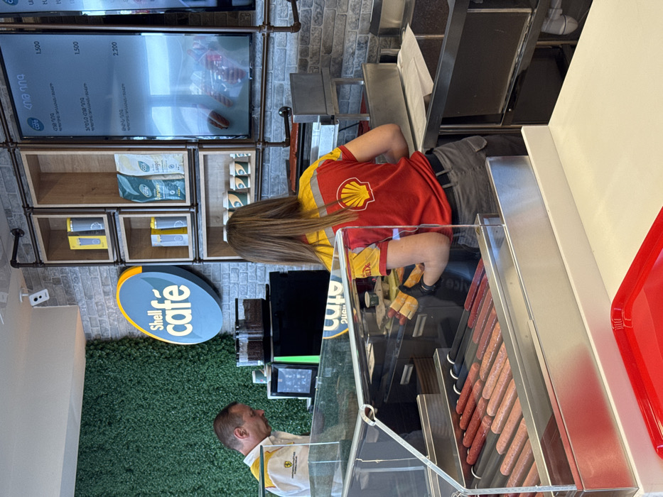 The scene depicts two workers at a Shell café, one wearing a red and yellow Shell uniform and attending to hot dogs in a display case, the other in a similar uniform standing near the counter