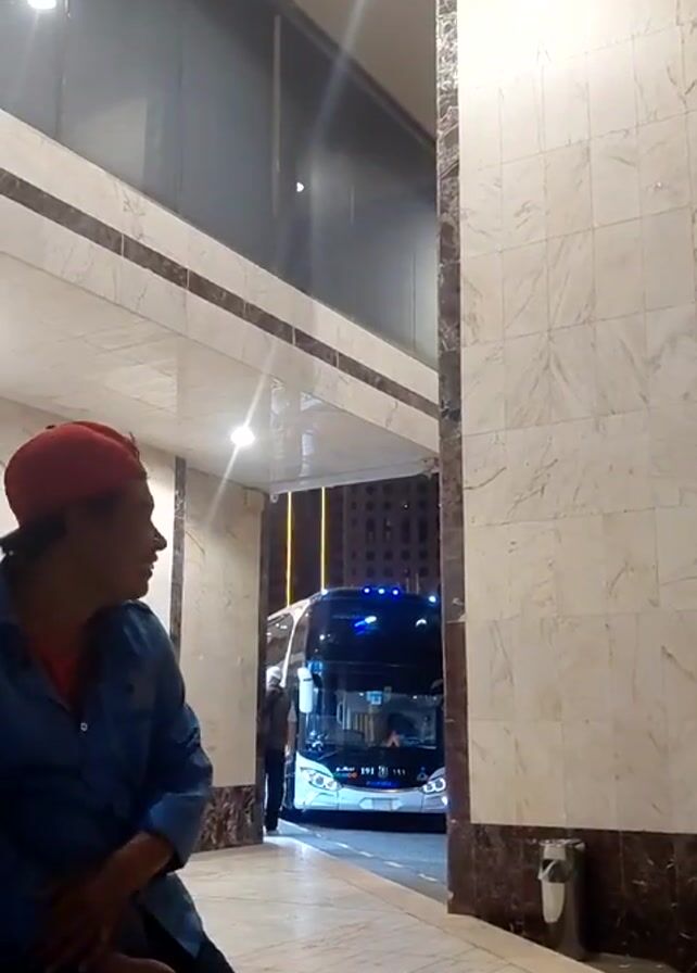 A man in a red baseball cap and a blue button-down shirt sits and smiles, then puts his hand to his chest and talks. He appears to be watching people exiting a tour bus. The bus is double-decker and white with blue lights. The scene takes place in an indoor entryway with marble floors and walls. There is a large window behind the man.
