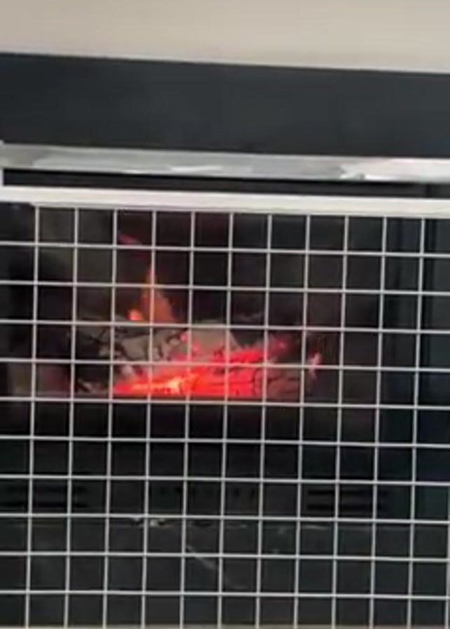 fireplace with a fire burning inside, viewed through a white grid safety screen