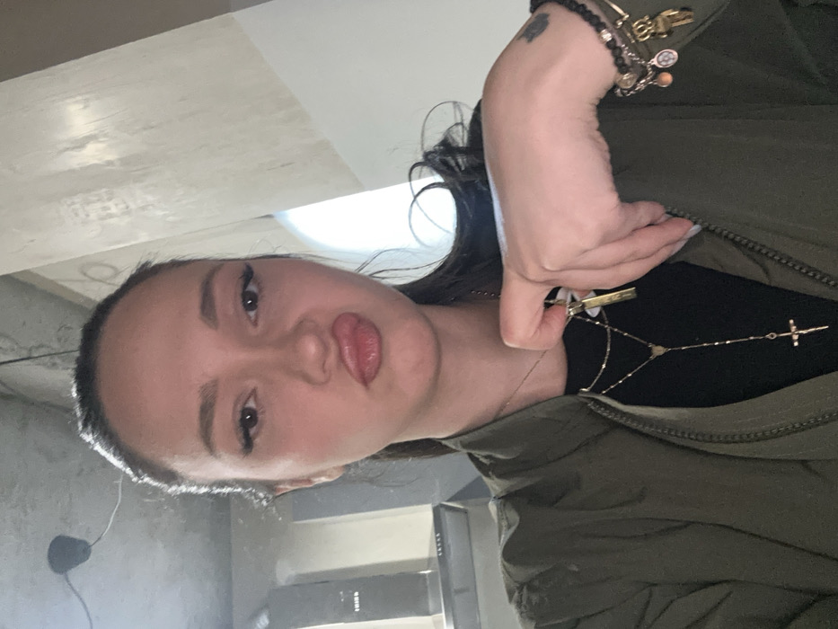 The image depicts a female subject in an indoor setting, identified as being in the city of Zovuni, Armenia. The subject, positioned centrally, has dark hair pulled back and wears an olive green zippered jacket over a black garment. Her lips are pursed forward in a "pout" expression, and she looks directly at the camera. Her right hand, with light nail polish, is touching or adjusting a gold-colored rectangular pendant on a chain, which is layered with two other gold-colored necklaces, one featuring a crucifix pendant. Multiple bracelets, including beaded and charm types, are worn on her left wrist, and a dark tattoo is visible on the back of her left hand. The background on the left reveals a silver-colored range hood appliance in what appears to be a kitchen area. The ceiling is a light grey, possibly concrete, with a dark circular fixture and a wire. To the right, a light-colored, textured wall or pillar is visible above a plain white surface.