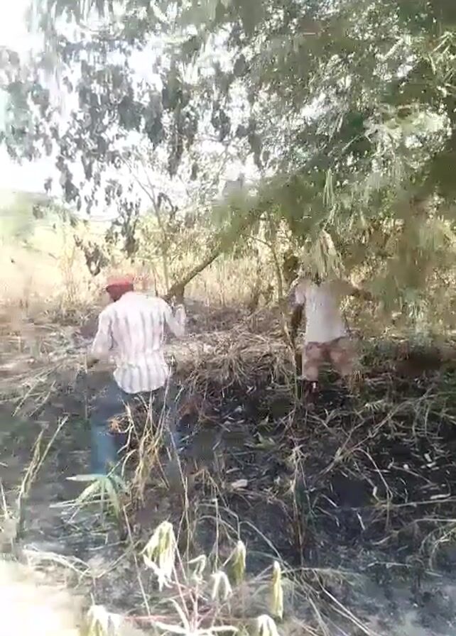 Two men stand in a field littered with burned vegetation. One man is using a long, green pole to knock down vegetation from an overhanging tree. He is wearing a red cap, a plaid shirt, and blue jeans. The other man is wearing a white shirt and patterned shorts. The environment appears to be a field near a forest, with evidence of recent burning.