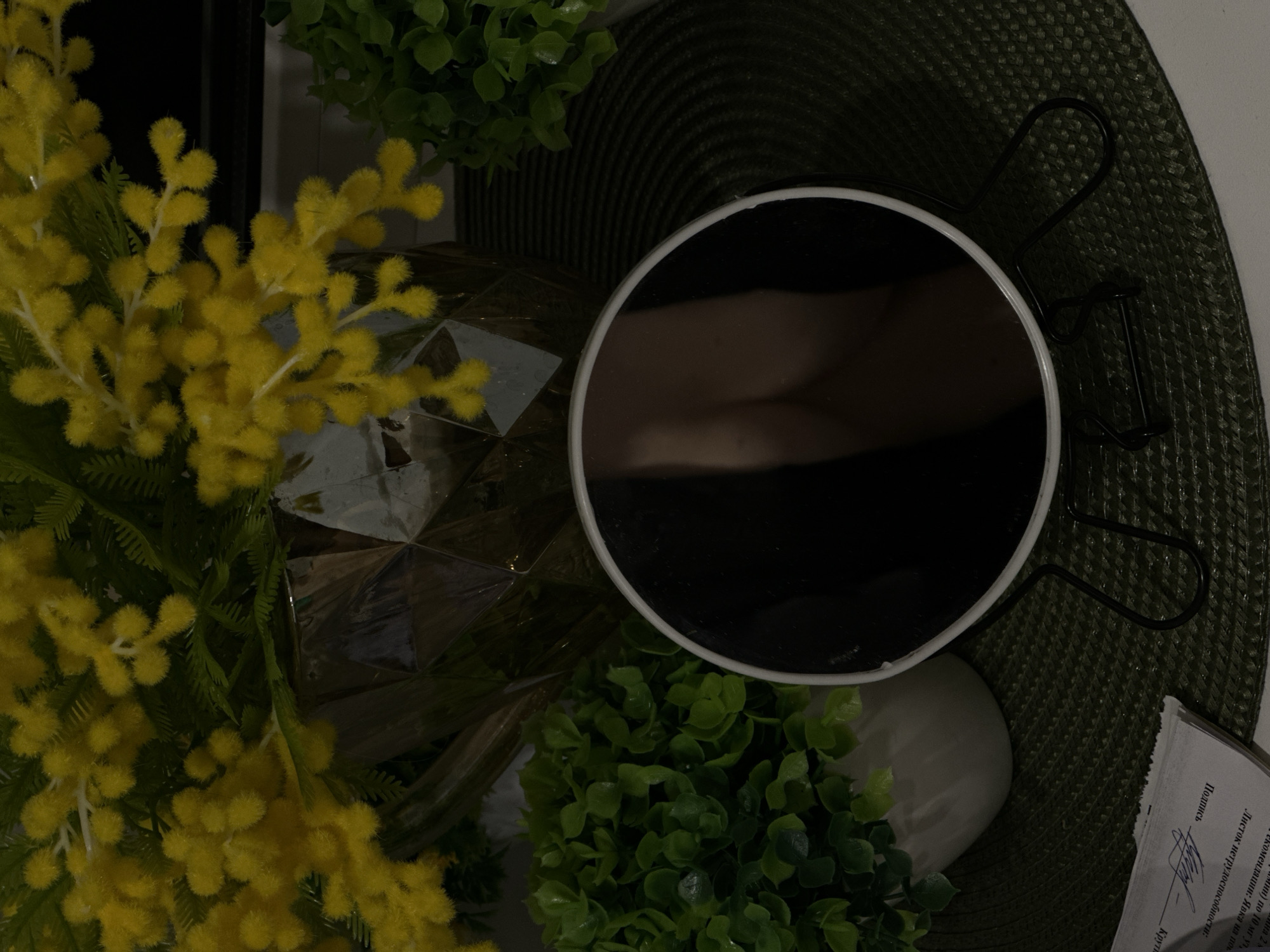 The image presents a tabletop scene arranged with various objects. A bouquet of yellow flowers is prominently displayed on the left, next to a faceted glass vase. Small green plants are positioned around a round mirror with a white frame and a black stand. The mirror reflects an ambiguous dark shape, making its specific nature unclear. A dark green woven mat serves as the backdrop, and a partially visible sheet of paper with printed text in Russian is located on the lower right edge. The limited field of view and close proximity of the objects suggest a still-life arrangement with a focus on aesthetic composition. There is no indication of any specific location in Oktyabr'skii, Russia.