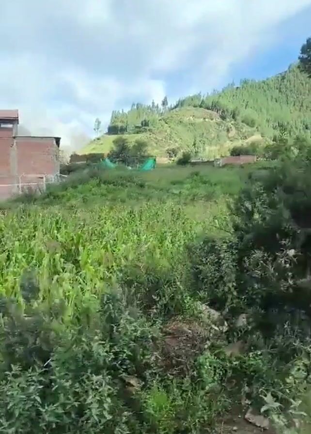 The camera looks out of a vehicle driving through a rural area. There is a field of corn on the right of the vehicle, along with other bushes and trees. There is a brick building to the left of the cornfield. A grassy hill with trees is in the background. The sky is cloudy. The vehicle continues to move forward as the camera looks at the scenery. The audio describes the landscape as a valley.