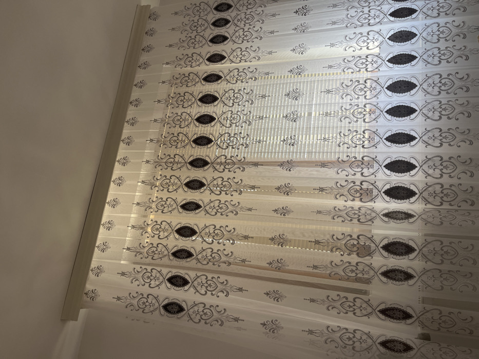The image depicts an interior space in the city of Unknown, Unknown, focusing on a window assembly. Dominating the frame are translucent, light-colored curtains adorned with a repeating pattern of dark gray, ornate scrollwork and vertical marquise-shaped motifs. These curtains hang from a light-colored valance or curtain track positioned near the ceiling. Behind the sheer curtains, white horizontal Venetian blinds are visible through the fabric, with their slats partially angled, allowing diffused light to enter. A plain white wall is visible on the left, and a white ceiling extends across the top. No individuals or active interactions are present. The lighting is ambient and appears to originate from the window, illuminating the curtains and blinds.