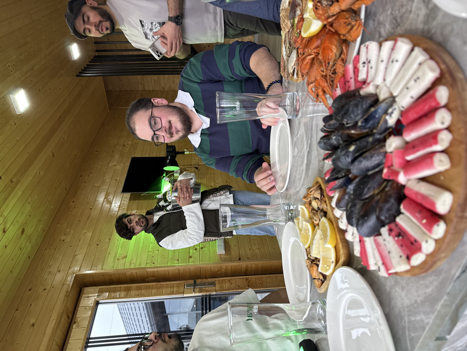 An indoor dining scene is depicted within a wood-paneled establishment in Voskevaz, Armenia. Four adult males are present around a grey marble-patterned table. Centrally, a man wearing a green and blue striped shirt and glasses is seated, exhibiting a faint smile while his hands rest on a white plate. To his left, a man in a dark vest over a white shirt stands, holding a silver bucket containing multiple green-bottled beverages. To the right of the seated man, a male subject in a grey cap holds a light-colored smartphone. A fourth man is partially visible on the far left, seated at the table. The table is extensively covered with food items and utensils. In the foreground, a circular wooden platter holds mussels in their shells, bordered by radially arranged red and white crab sticks, some featuring black speckles. Adjacent to this, a smaller wooden platter contains shelled mussels and multiple lemon wedges. Further right, a plate displays numerous cooked red crawfish, also garnished with lemon wedges, and another plate holds bivalves. Multiple empty clear drinking glasses and white dinner plates are positioned on the table surface. A glass-paneled door on the left offers a partial view of an exterior tiled roof structure. A green light source is visible behind the standing man with the bucket, casting a green hue on the adjacent wooden wall paneling.