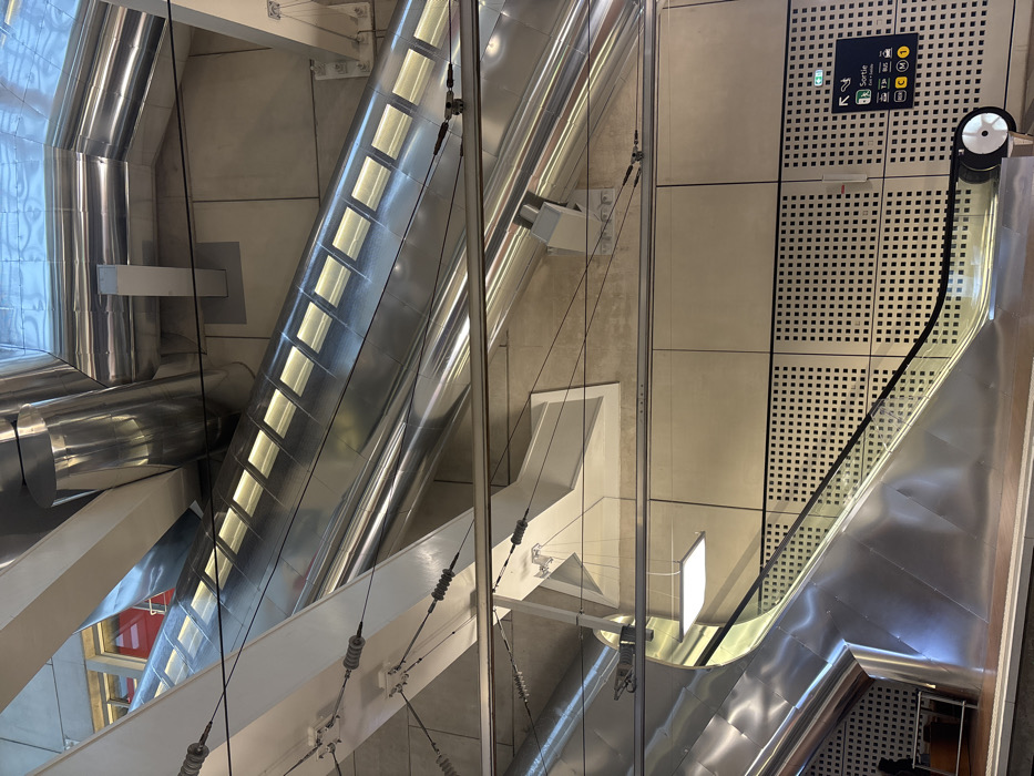 This image depicts the multi-level interior of the Châtelet–Les Halles RER station in Paris, France. The scene is characterized by a complex interplay of modern architectural and mechanical elements. Two prominent escalators are visible: one ascends towards the upper right, featuring illuminated steps, and another descends into the lower-left foreground, its base terminating on a reddish-brown tiled floor. Both escalators have sleek, reflective silver metal side panels and black handrails. The upper and mid-sections of the frame are dominated by numerous large, polished, cylindrical and rectangular metallic ducts and structural beams, which crisscross diagonally and horizontally, reflecting light. White, angular support beams are interspersed among these metallic structures. Multiple taut black cables, equipped with white insulators, are suspended across the mid-ground, indicating overhead infrastructure. The background walls consist of light-colored, smooth panels, some featuring a grid pattern of small square perforations. Other wall sections are textured concrete. Lighting includes recessed illumination within the steps of the upper escalator and a rectangular LED panel light suspended from the ceiling in the mid-left. In the lower right, a dark blue directional sign with white text and icons indicates "Sortie" (Exit), accompanied by an arrow pointing left and upwards. Below this, symbols for various public transport lines are displayed: "RER C," "Bus," "M 1," "M 7," and "M 13," along with a green exit symbol. A single individual is partially visible, mostly obscured by a metal structure, at the base of the lower escalator on the left side of the frame. No specific actions or interactions are discernible from this individual. The environment is bright, clean, and exhibits a strong contemporary, almost industrial, aesthetic common to major urban transit hubs.