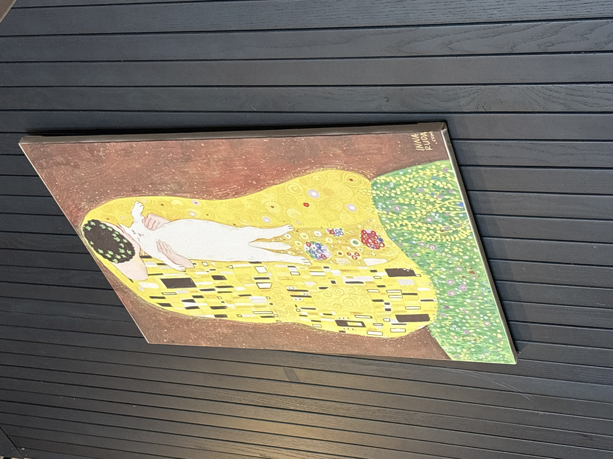 An indoor scene in Nha Trang, Vietnam, displays a vertically-oriented framed artwork mounted on a dark, vertically-paneled wooden wall. The artwork is an adaptation of Gustav Klimt's "The Kiss," featuring a stylized white cat held by two figures largely obscured by golden, patterned robes adorned with geometric and swirling shapes. The figures' heads are visible, with the head on the left appearing to have green foliage instead of hair. The background of the painting transitions from a textured reddish-brown at the top to a vibrant green, flower-filled ground at the bottom. A signature reading "INNA RUDA .COM" is present in the bottom right corner of the artwork. The wall panels show visible wood grain and are uniformly dark. The photograph is taken from a slightly low angle, looking upwards at the artwork, which is positioned to the right of the frame's center.
