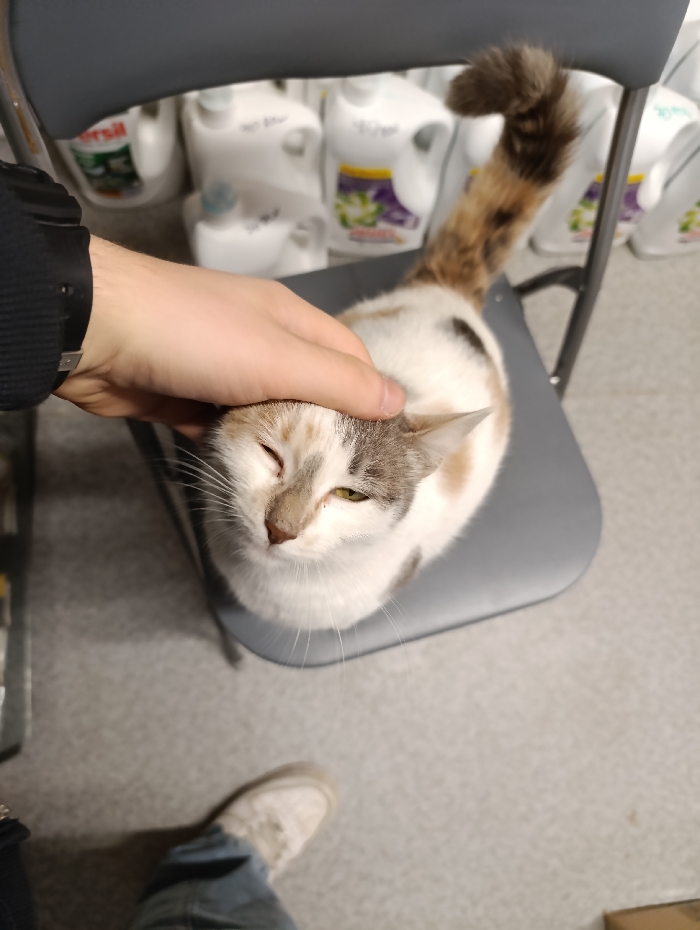 The scene is set indoors, likely within a commercial or storage area in Silistra, Bulgaria, identifiable by rows of white plastic containers, some bearing the "Persil" brand, stacked on shelves in the background. A calico-patterned domestic cat, predominantly white with brown and black patches, is seated on the grey fabric seat of a folding chair. A human's left hand, with a dark wristband, is positioned on the cat's head, appearing to stroke it. The cat's eyes are partially closed, and its gaze is directed slightly upwards and to the left. Its tail, exhibiting a similar calico pattern, is raised and curved. The lower portion of a human's left leg, clad in blue denim jeans and a white shoe, is visible on the light grey floor in the lower left quadrant of the image.