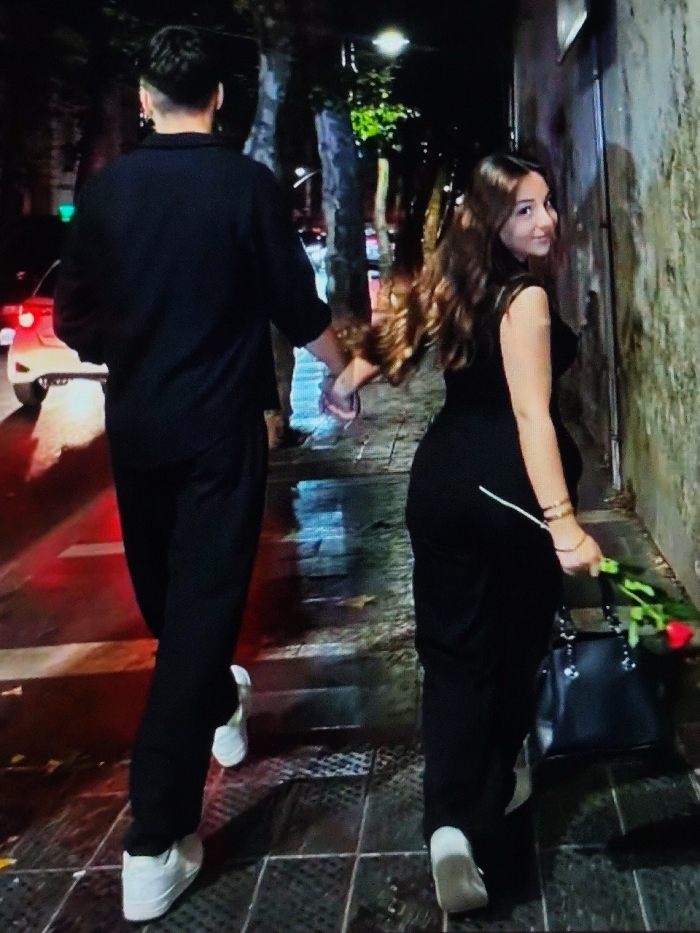 An evening scene in Charleroi, Belgium, depicts two individuals walking hand-in-hand on a wet, tiled sidewalk. The male, positioned ahead and to the left, is observed from behind, wearing a black long-sleeved shirt, black trousers, and white sneakers. He has short, dark hair. His right hand grasps the left hand of the female. The female, positioned slightly behind and to the right, is wearing a black sleeveless top or dress, black trousers, and light-colored shoes. She possesses long, wavy brown hair and is looking back over her left shoulder towards the viewer with a subtle smile. Her right hand holds a black handbag and a single red rose with a green stem. Multiple thin gold bracelets are visible on her right wrist. The sidewalk is wet and reflects ambient light from streetlights and a vehicle with illuminated red taillights visible in the blurred background on the left. A light-colored, textured wall runs along the right side of the frame, indicating a building.