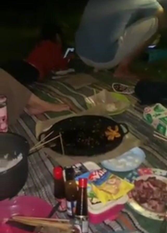 A group of four people are sitting on a striped blanket on the ground in the dark. There is a spread of food between them. In the center of the frame are plates with food remnants, a skillet with skewers, small bottles of condiments, and packaged snacks. One person in a pink shirt is sitting and looking at a phone. Another person in a red shirt is lying down, also looking at a phone. A third person in a blue shirt is squatting and looking at something out of frame. A fourth person is partially visible on the left side of the frame. There is a pot of rice next to them. The environment appears to be outdoors at night.