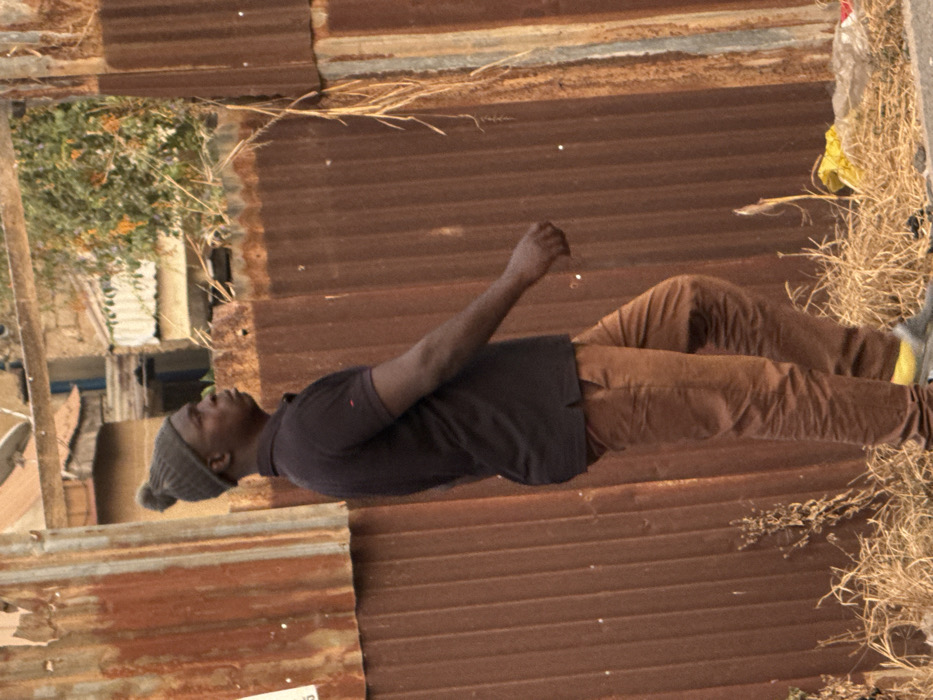 A person stands on rusty corrugated iron, wearing a dark short-sleeve shirt, brown pants, and a gray beanie. Dry grass and debris scatter around the person's feet. Background houses and foliage are visible through an opening in the metal barrier. The person's arm is raised, hand open. One shoe is visible at the end.