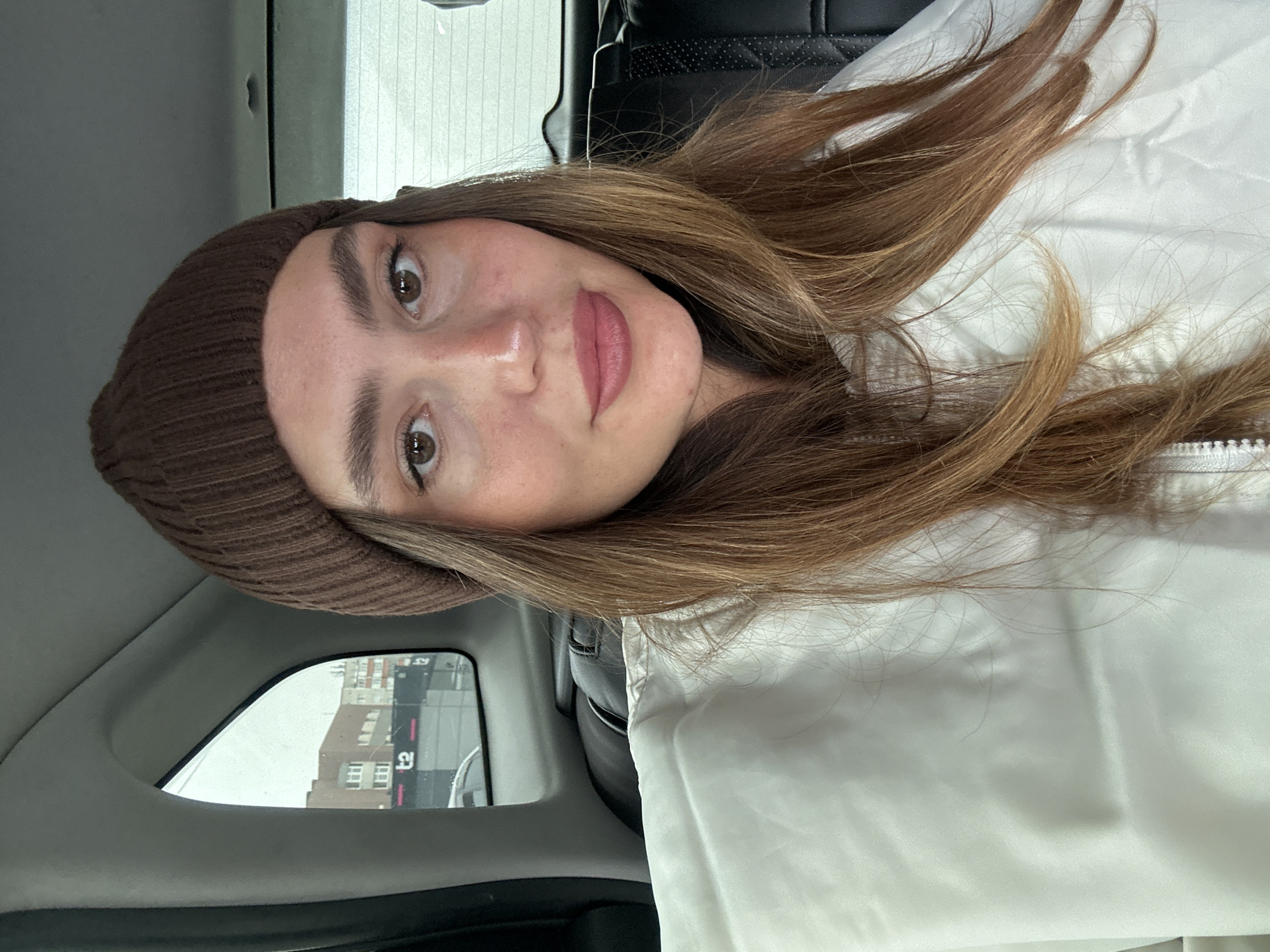 A female individual is depicted in a close-up, positioned within the rear passenger compartment of a vehicle. She has medium-brown hair and dark brown eyes, and is wearing a dark brown knitted beanie and a light-colored, possibly white or off-white, collared jacket. Pink lipstick is applied to her lips. Through the vehicle's left rear window, an urban street scene in Surgut, Russia, is visible under an overcast sky. The exterior view includes a multi-story brick building with white-framed windows and a dark billboard displaying a white "t2" logo, identifiable as a Tele2 advertisement. A dark, textured seatback is visible in the background inside the vehicle.