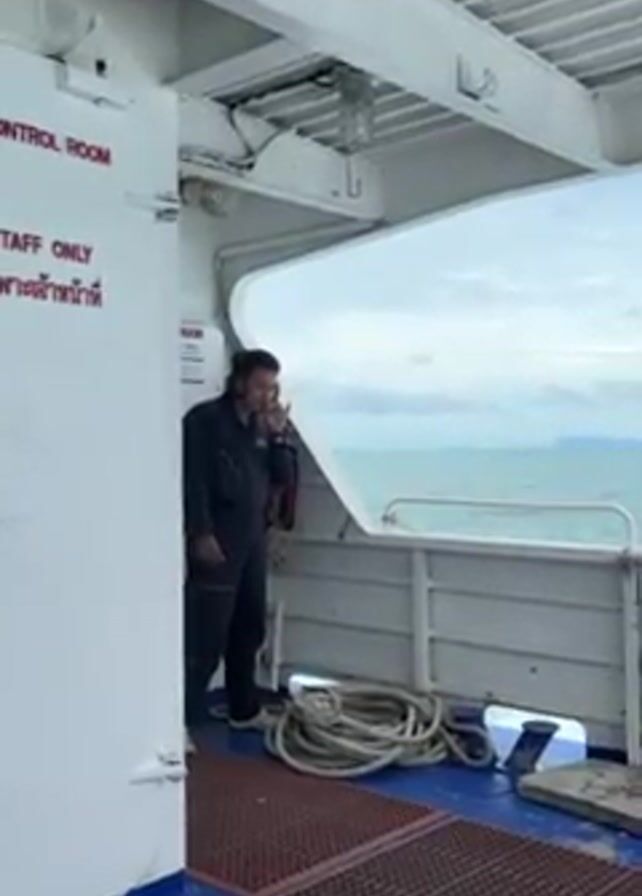 man standing on a boat. The man is wearing a dark jumpsuit and has a headset on. He appears to be talking on the headset and gesturing. Behind him is a white wall with a door labeled "Control Room, Staff Only" in both English and Thai. To the right of the man, there is a view of the ocean with islands visible in the distance. There is a coiled rope on the deck of the boat. The boat's deck has a patterned, possibly non-slip surface. The sky is overcast.