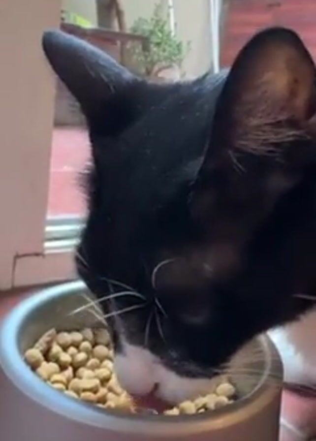 A close-up shot depicts a black and white cat eating from a silver-colored bowl filled with dry cat food pellets