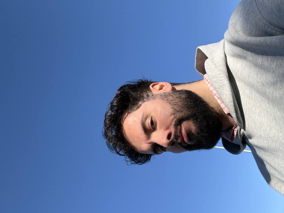 A male individual is depicted in a low-angle, close-up portrait against a clear, cloudless blue sky. He has dark, wavy hair and a full, dark beard and mustache. His complexion is fair, and he maintains direct eye contact with the camera, exhibiting a neutral expression. He is dressed in a light grey hooded sweatshirt, worn over a visible collared shirt patterned with light pink and white checks. Direct sunlight illuminates the scene from the upper right, casting soft shadows across his left side. A thin, light-colored vertical pole or mast is partially visible behind his left shoulder, suggesting a nautical environment. The scene is outdoors, likely at a marina or along the Douro River waterfront within Vila Nova de Gaia, Portugal.