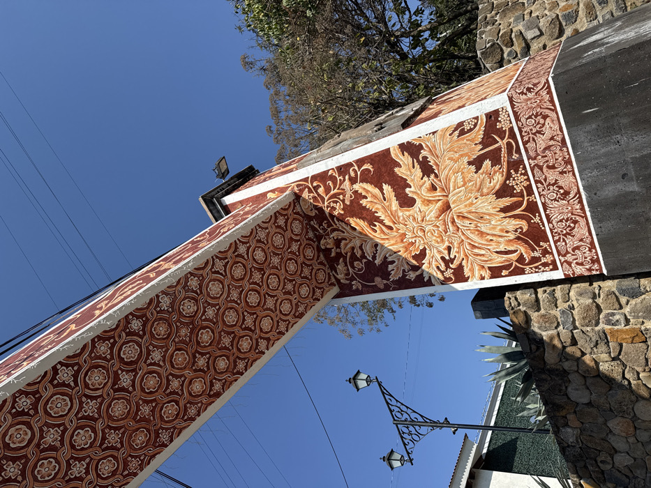 An archway with decorative patterns dominates the view against a bright blue sky. One side features a repeated geometric floral design in shades of brown, while the other displays a large, ornate leaf motif in similar hues. The archway is attached to stone structures on both sides, with additional details like a security light, power lines, and a vintage-style street lamp visible in the background.