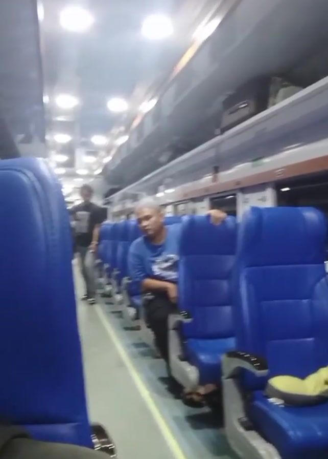 interior of a passenger train car. The seats are upholstered in blue. Two men are visible. One is seated, wearing a blue shirt, dark pants, and sandals. The other man walks down the aisle wearing a black t-shirt, light-colored pants, and sneakers. He is walking towards the camera, passing the seated man. Overhead storage compartments run the length of the train car. The lighting is bright. A person wearing a mask is visible in the foreground.
